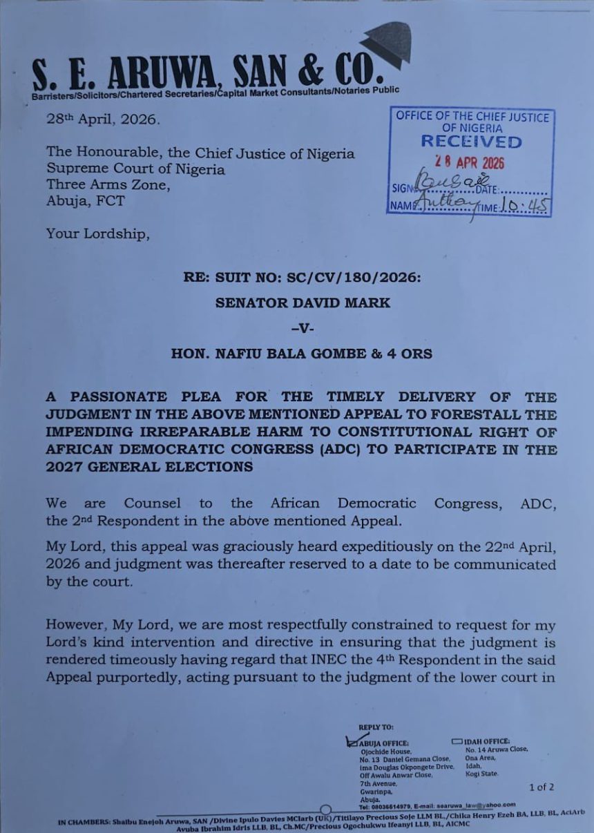 The David Mark-led faction of the African Democratic Congress (ADC) has written to the Chief Justice of Nigeria (CJN), urging the timely delivery of the Supreme Court judgment in the ongoing leadership dispute within the party.