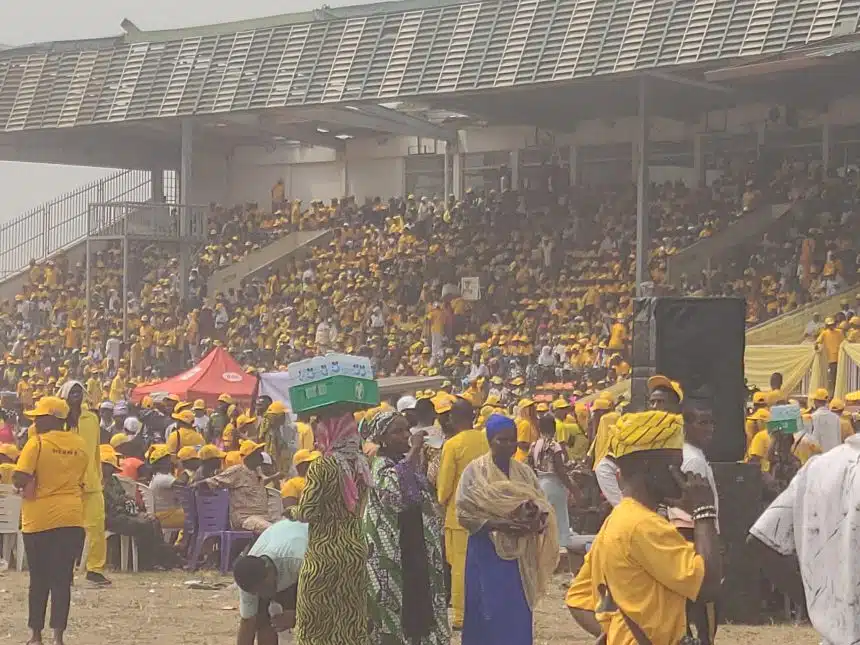 The ceremony, held at the historic Obafemi Awolowo Stadium (Liberty Stadium) in Ibadan, drew a massive crowd of supporters clad in yellow, who chanted “Oyo n pe o” (Oyo is calling you) and filled the venue with music, drumming, and enthusiastic celebrations. The turnout marked one of the largest political gatherings in the state in recent years.