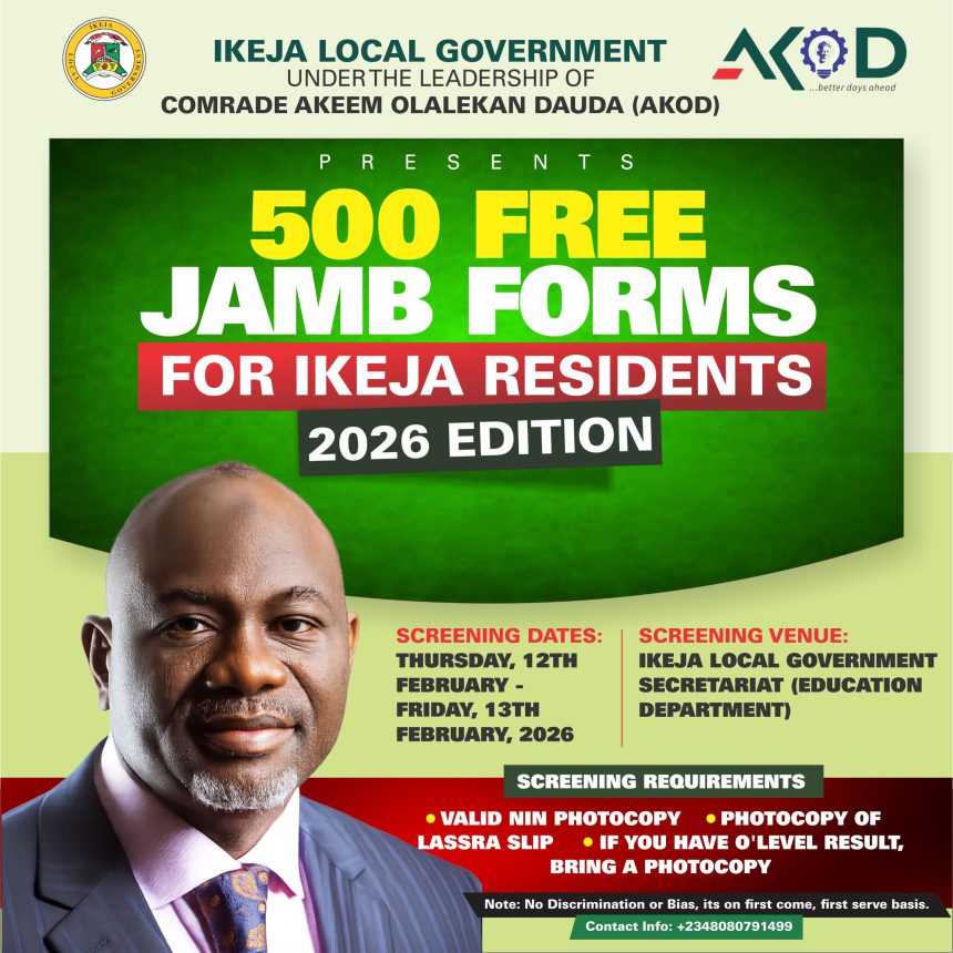 The Comrade Akeem Olalekan Dauda Educational Support (AKOD-ES) programme has announced the distribution of 500 free JAMB forms to eligible residents of Ikeja as part of its 2026 education support initiative.