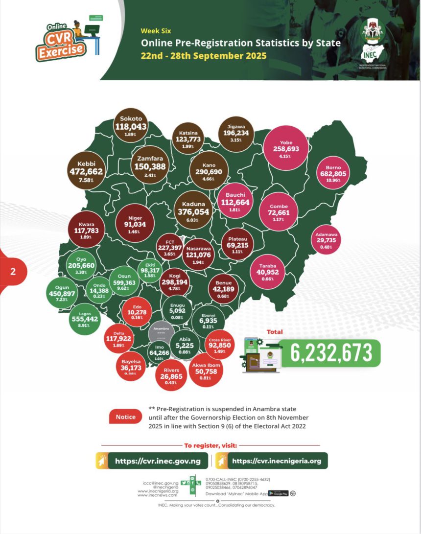 The Independent National Electoral Commission (INEC) says over 6.2 million Nigerians have completed their online pre-registration for the Continuous Voter Registration (CVR).