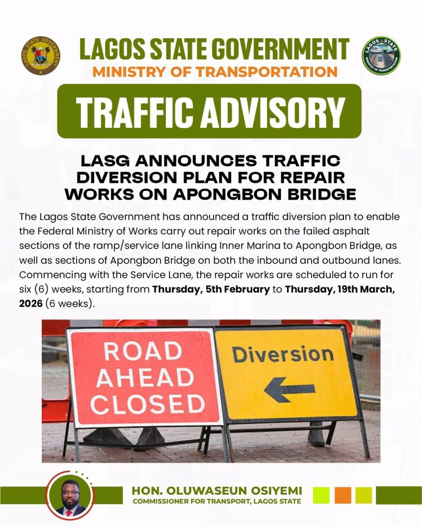 Commissioner for Transportation, Oluwaseun Osiyemi, said the rehabilitation of the Apongbon service lane will last for six weeks, beginning from today to Thursday, 19 March 2026.
